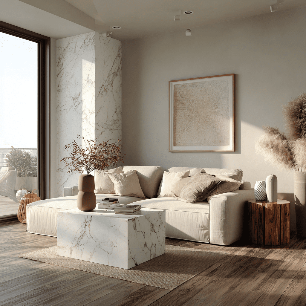 Neutral colors like beige, white, and gray work well. These colors help blend modern and organic elements seamlessly. Adding textures, like a stone accent wall or a woven rug, can also create interest.