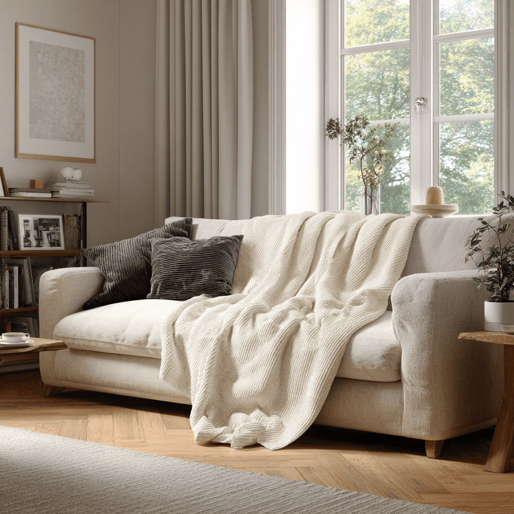 Choose a blanket in a neutral color like cream, taupe, or gray to maintain the room’s natural palette. This small addition can make the living area feel more inviting and cozy while keeping the overall design clean and modern.