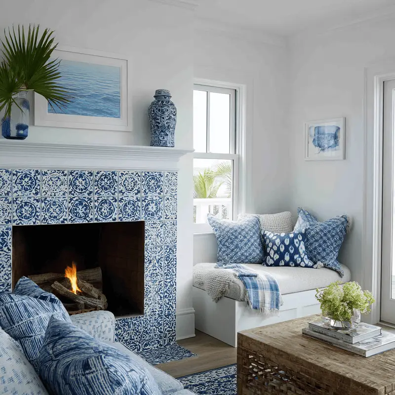 A blue and white tile surround brings coastal charm to your fireplace. Pick a pattern like herringbone or subway tiles for visual interest. Choose shades of blue that remind you of the ocean.