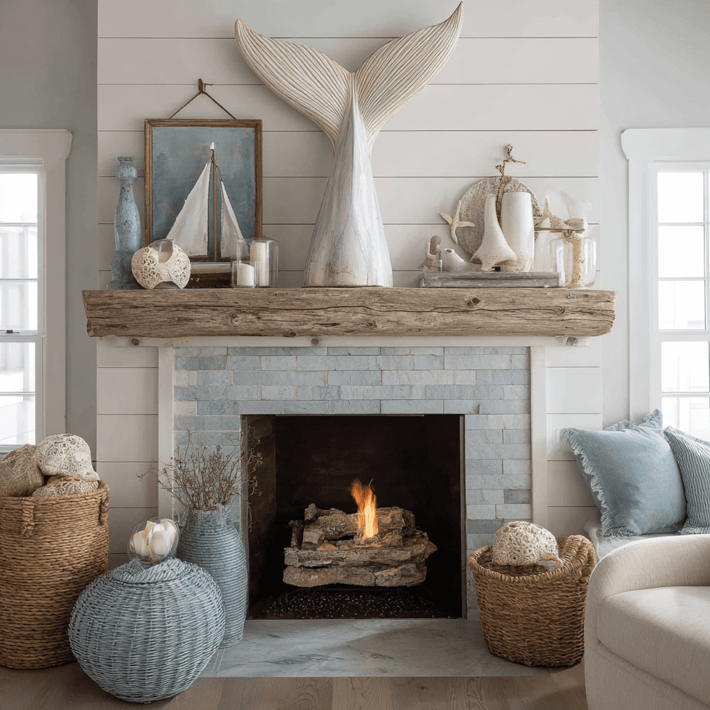 Whale tail sculptures add a unique coastal touch to your fireplace decor. You can place a glass or wooden whale tail on your mantel for a eye-catching focal point.
