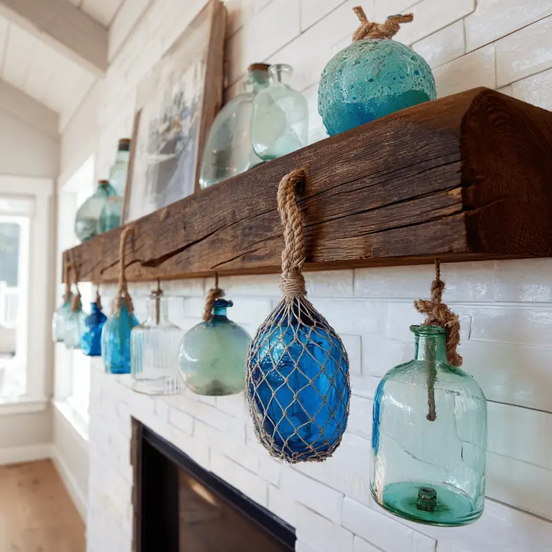 For a modern twist, try LED-lit glass buoys. These create a soft glow that enhances the fireplace’s ambiance. You can also hang glass buoys from fishing nets above the fireplace for a 3D effect.