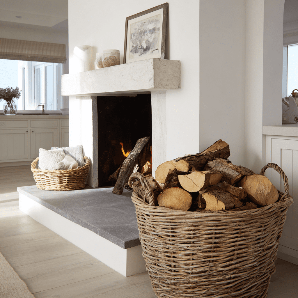 Wicker baskets add a charming coastal touch to your fireplace area. You can use them to store firewood neatly and stylishly.