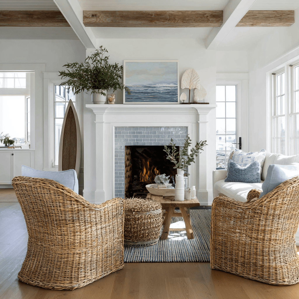 Rattan chairs can give your coastal fireplace a breezy, relaxed vibe. Place a pair of these woven beauties on either side of the hearth to create a cozy seating area.