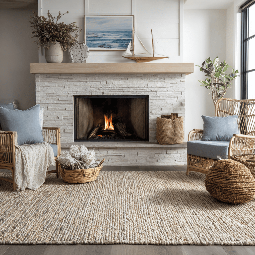 A seagrass rug can add coastal charm to your fireplace area. This natural fiber brings texture and a beachy feel to the space.