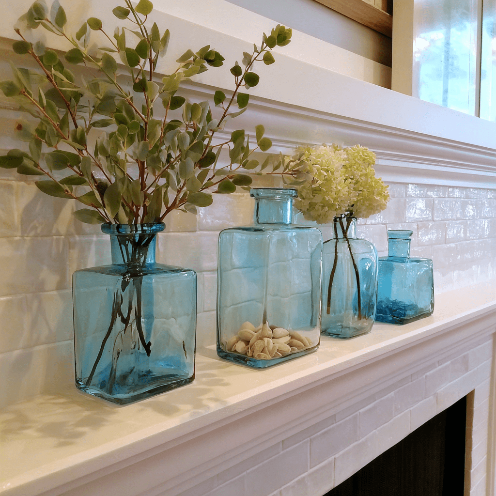 Aqua-tinted glass vases add a splash of coastal charm to your fireplace. You can fill them with water in shades of blue or green to match your room’s colors.