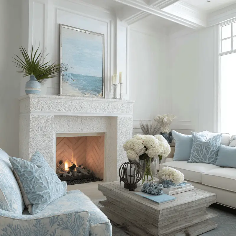 You can customize your fireplace to match your coastal decor. White-washed brick or blue tiles work well. These choices blend with ocean-inspired color schemes.
