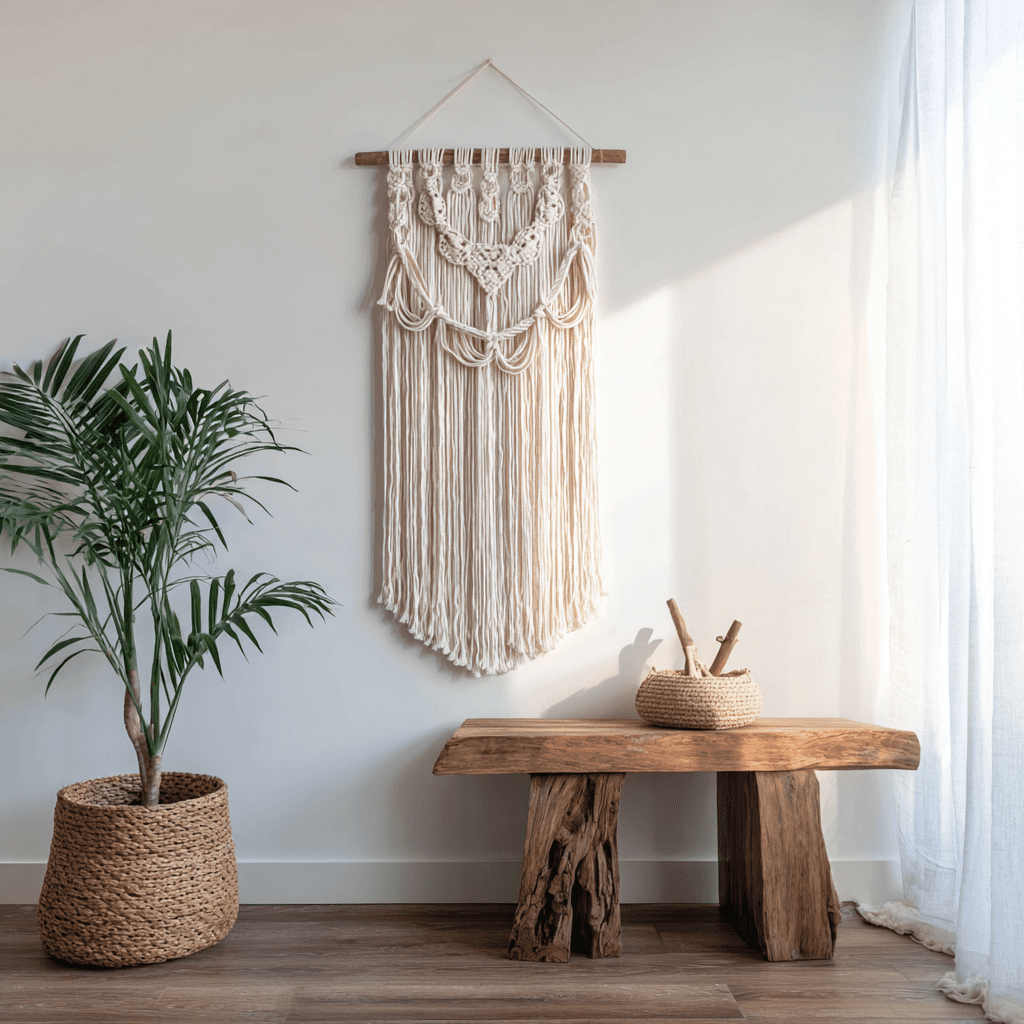 In traditional settings, large framed paintings or tapestries work nicely. Boho themes call for macrame wall hangings or colorful woven textiles.
