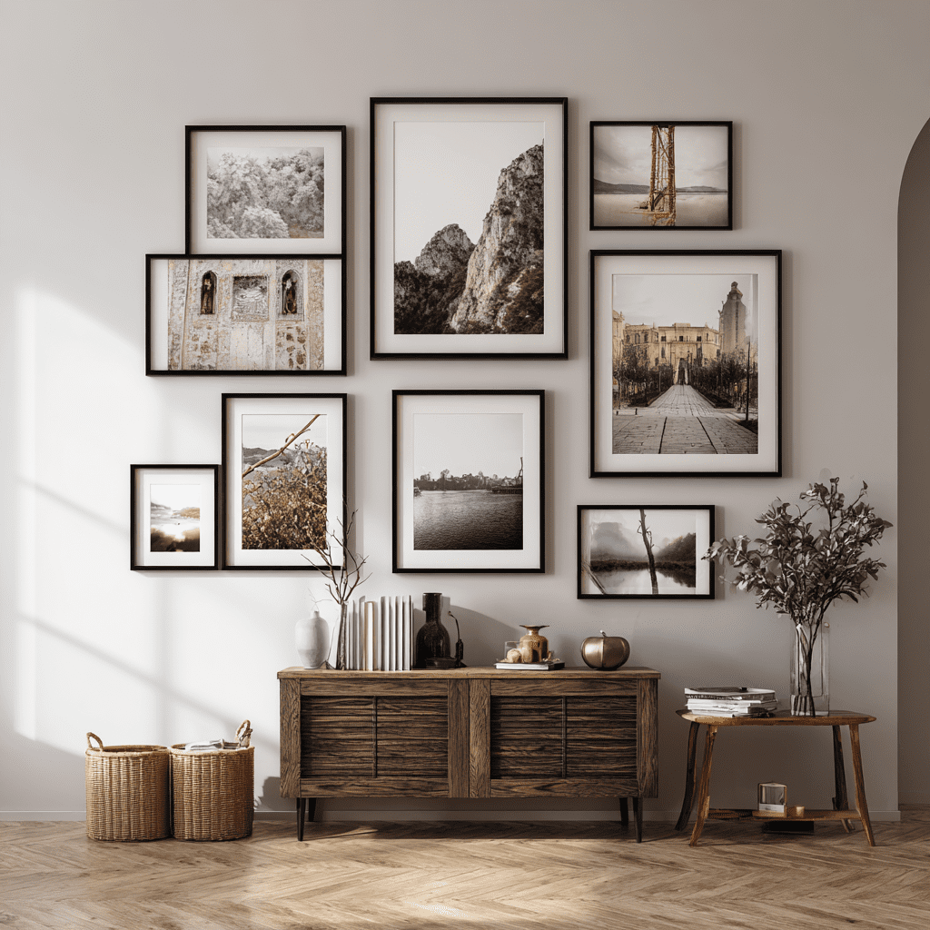 Try a symmetrical grid layout for a classic feel, or go for an organic arrangement for a more casual vibe. Leave some space between frames to let the wall breathe.