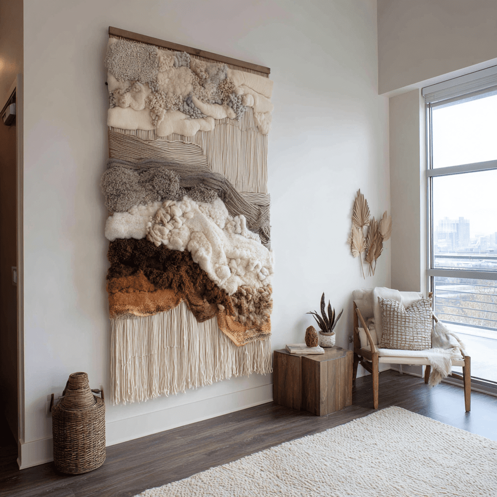 Fiber art weaving adds texture and warmth to tall walls. You can create or buy woven wall hangings in various sizes and styles.