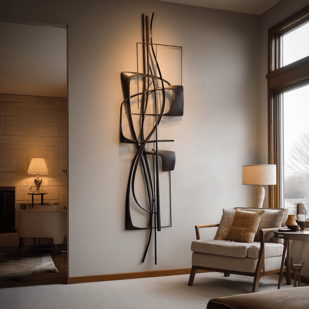 Large metal sculptures work well as statement pieces above fireplaces or sofas. For a bolder look, try arranging multiple smaller geometric pieces into a gallery wall.