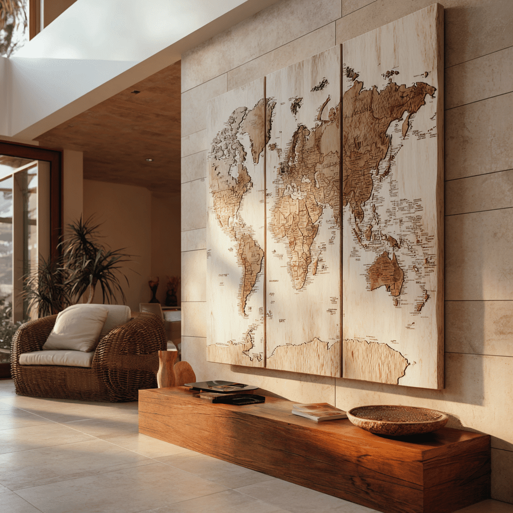 Wooden world maps make eye-catching wall decor for tall spaces. These pieces blend artistry and geography, adding warmth and global flair to your room. You can find maps in various sizes to fit your wall.