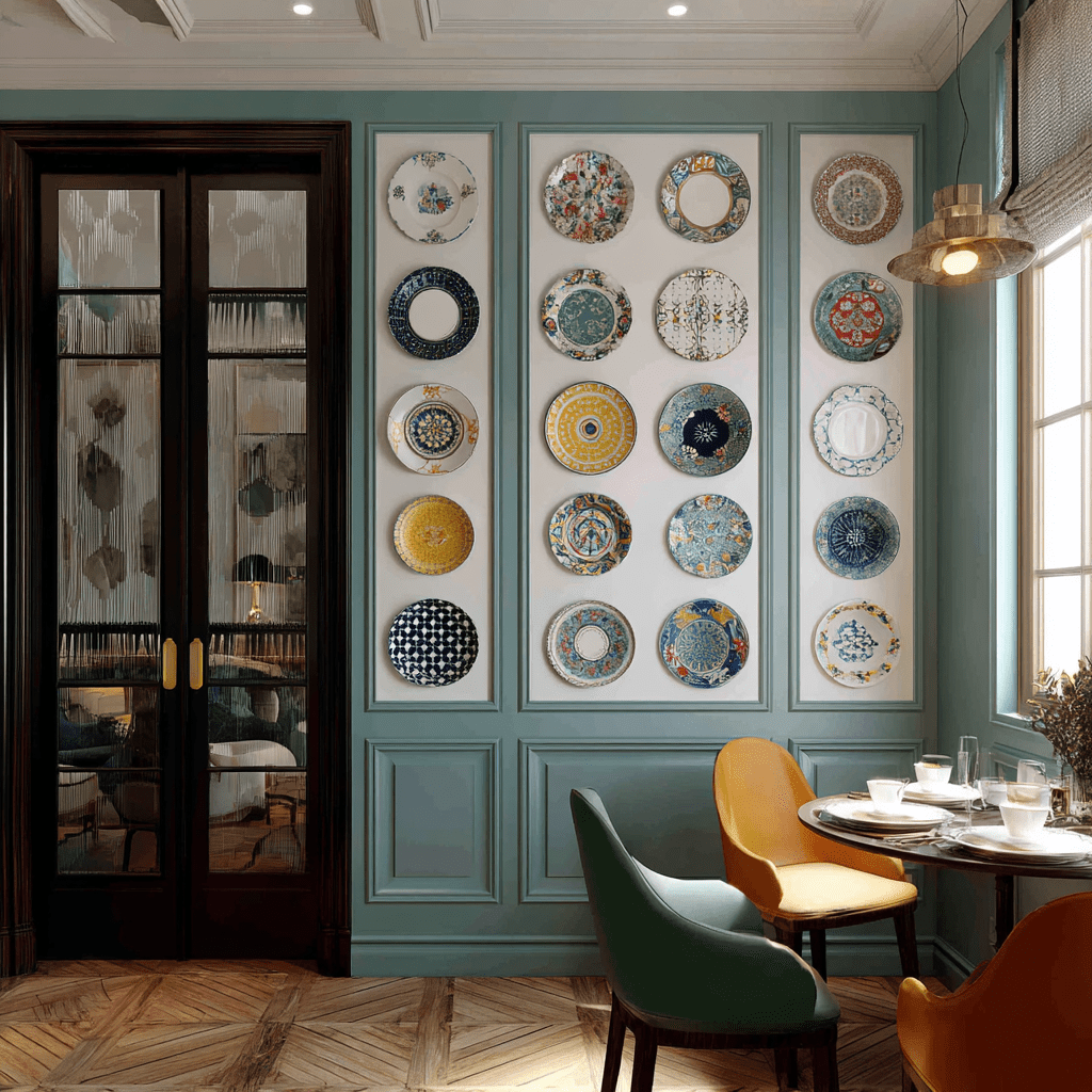 Mix and match plate sizes and designs for visual interest. Use neutral colors for a calm look or bold patterns for a statement piece. Hang plates securely with adhesive hangers or decorative plate hooks.