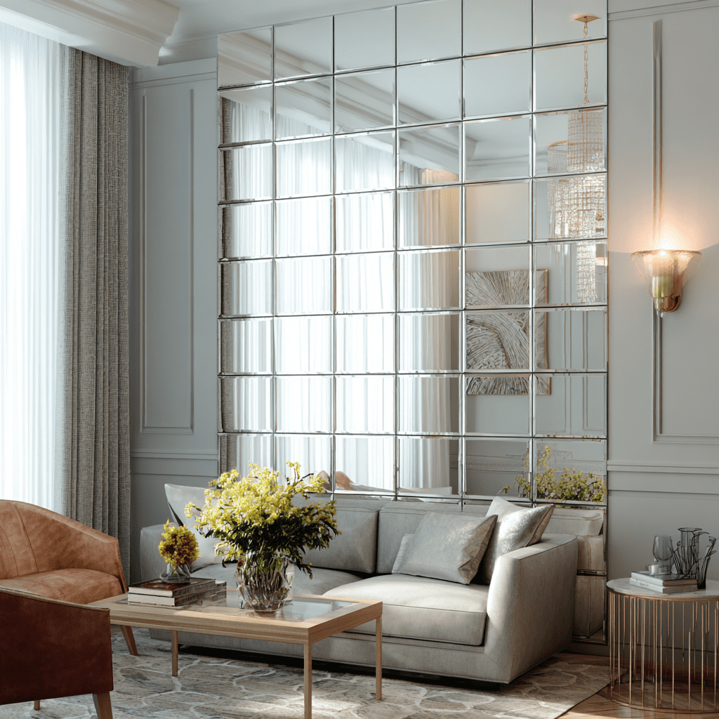 Beveled mirror panels reflect light and make rooms feel bigger. They work well in entryways, living rooms, and bedrooms.