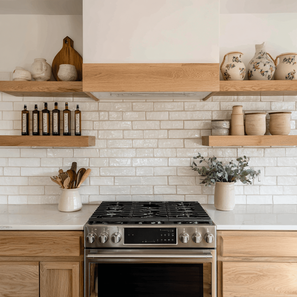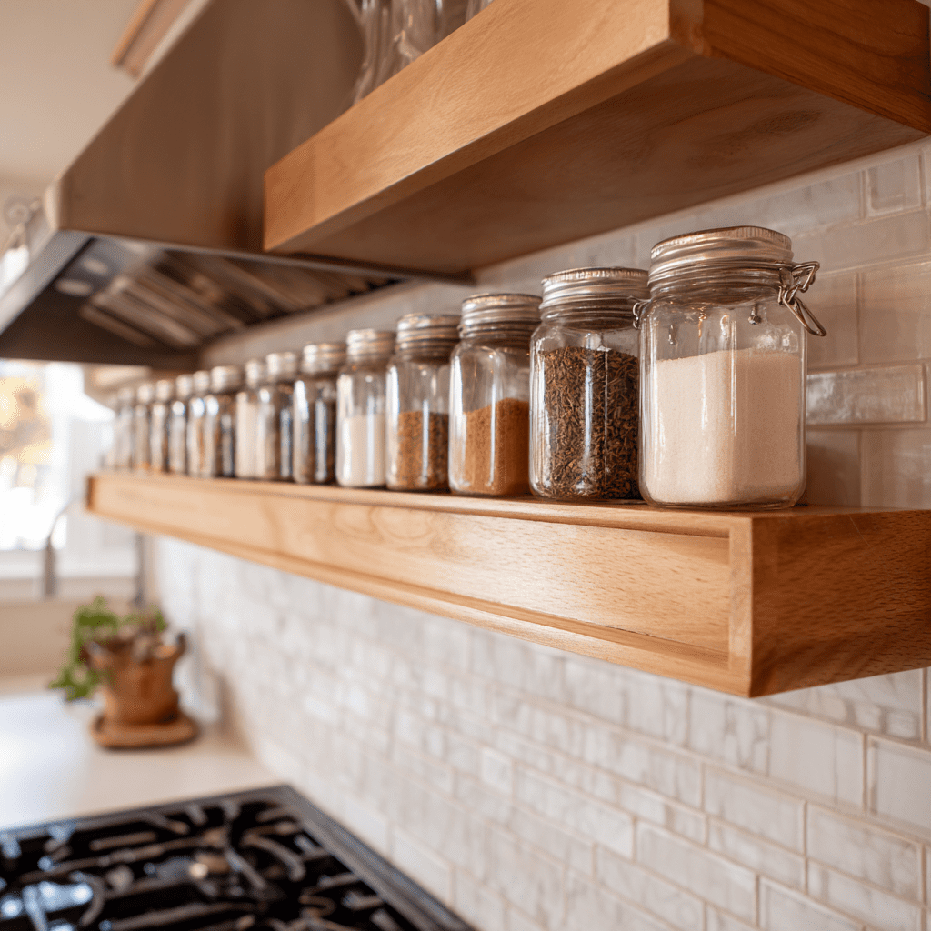 A floating wood shelf is the go-to classic for a reason. It adds warmth, storage, and instant style without crowding your cooking space.