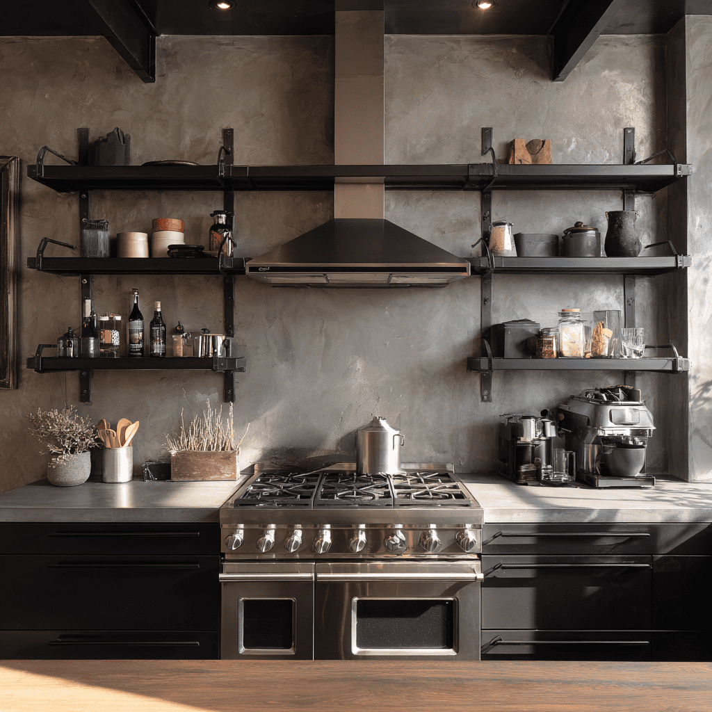 If you love an edgy, modern look, this one’s for you. A metal shelf brings durability and attitude right above your stove.