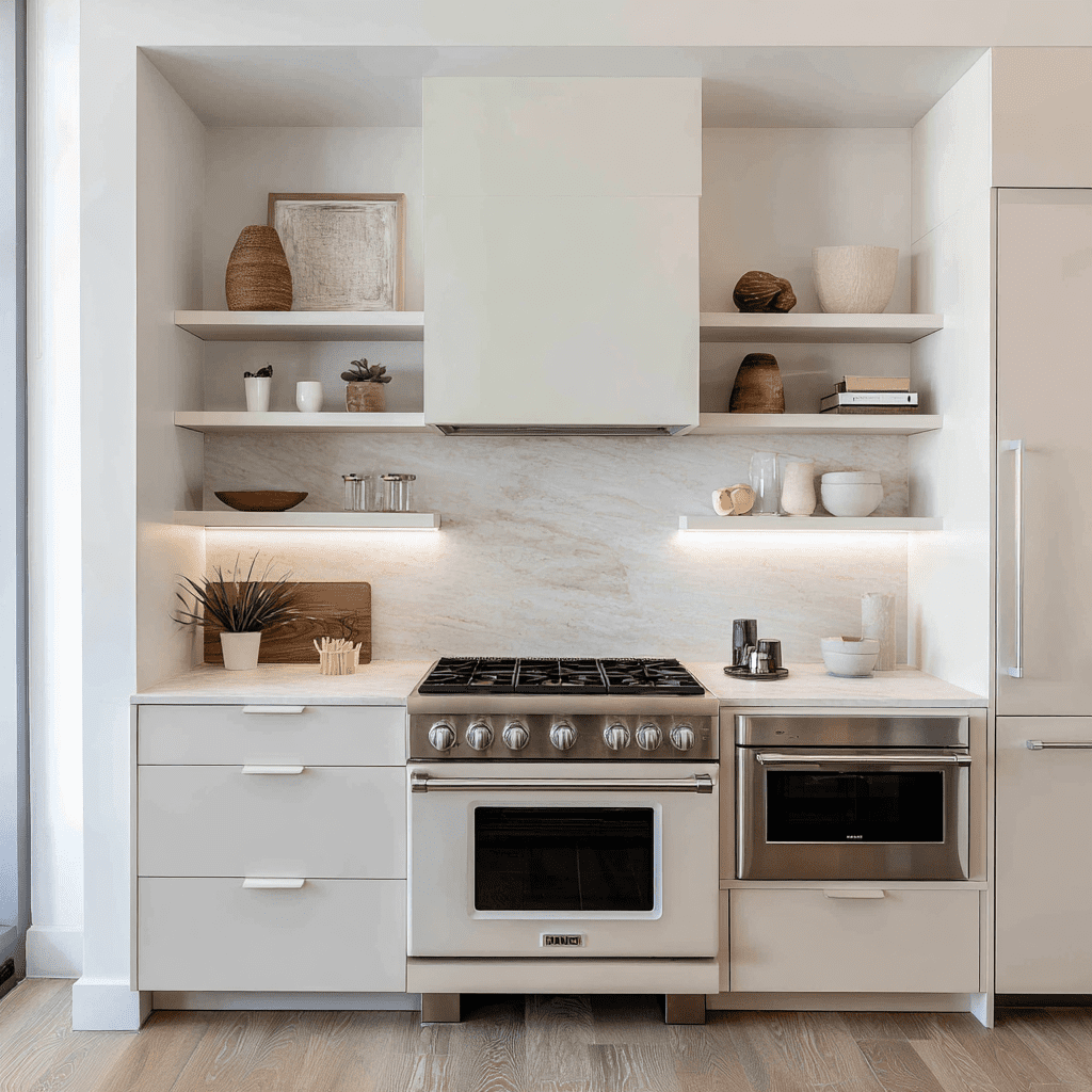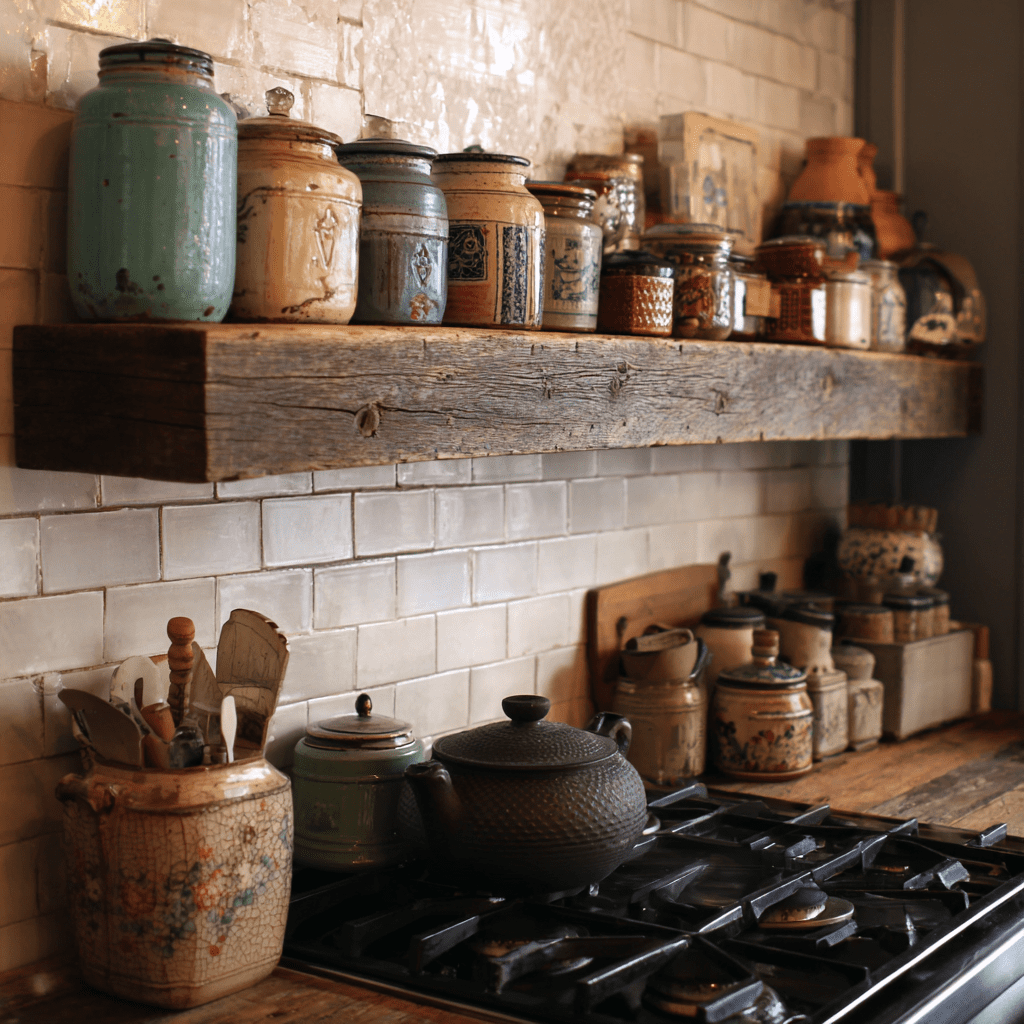 Add ceramic jars or vintage signs. It’s one of those above stove shelf ideas that feels timeless.