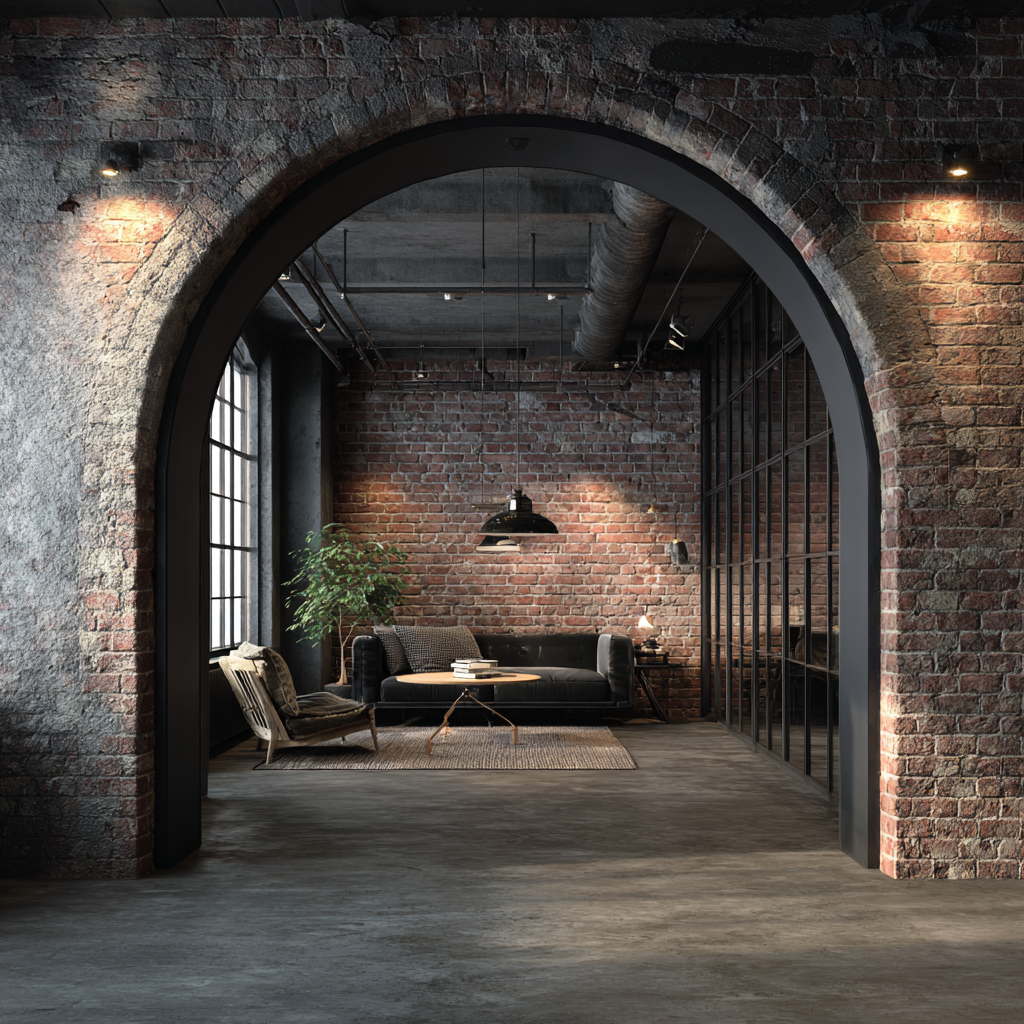 Metal framing around the archway can enhance its industrial appeal. Using dark, matte finishes can add to the effect.