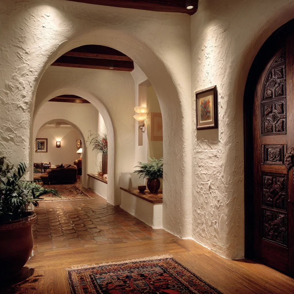 Often constructed with white or off-white stucco, they complement the red barrel tile roofs typically found in Spanish Colonial homes. The arches can be found in interior spaces like hallways and doorways, as well as exterior spaces such as courtyards and entrances.