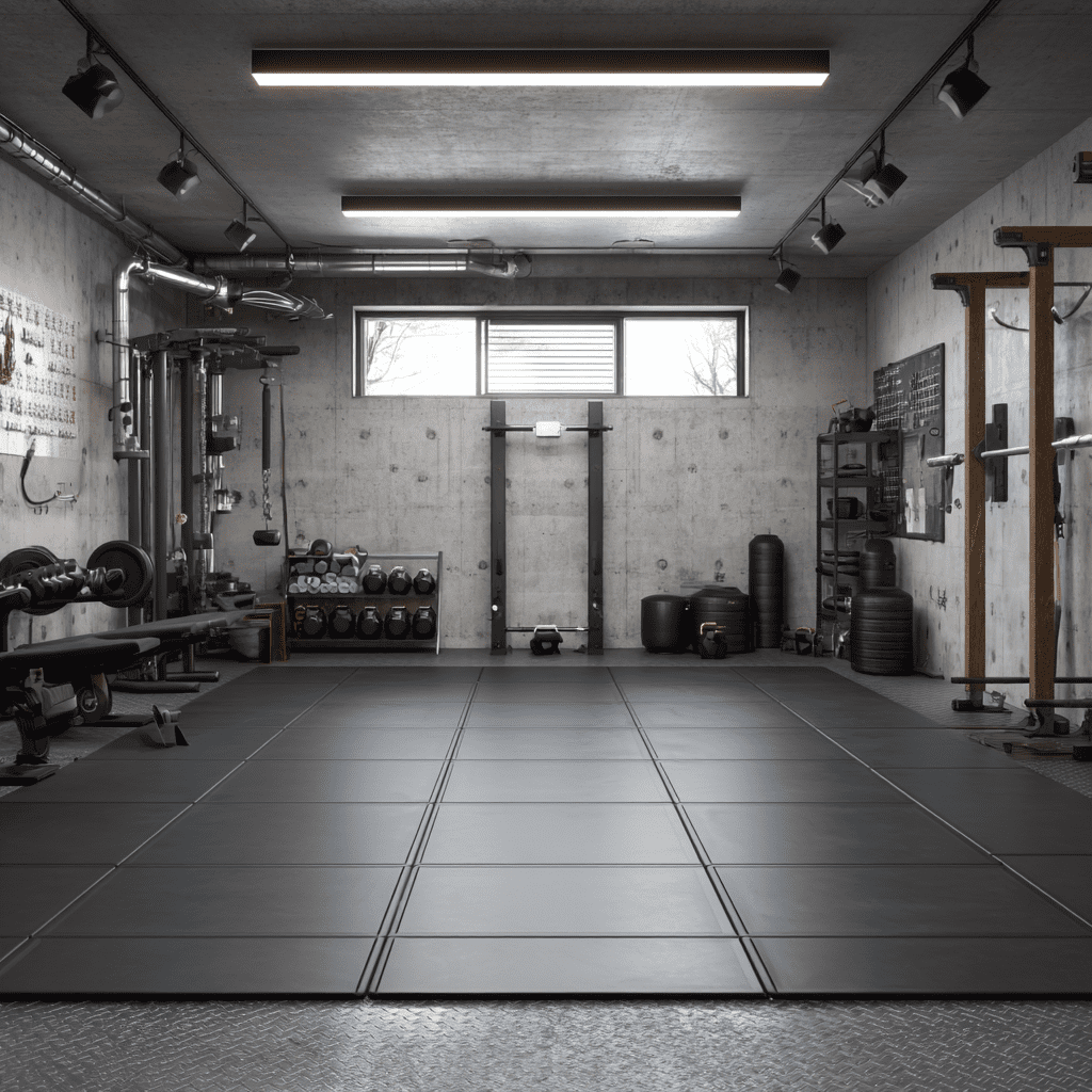Rubber tiles instantly make your basement feel like a real gym. They protect the concrete, absorb shock, and keep things quiet. Plus, they’re super easy to install.