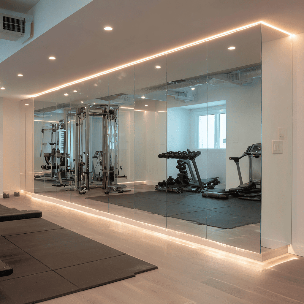 Mirrors make basements feel double their size. They brighten dark corners, help you monitor form, and give the space a professional gym vibe.
