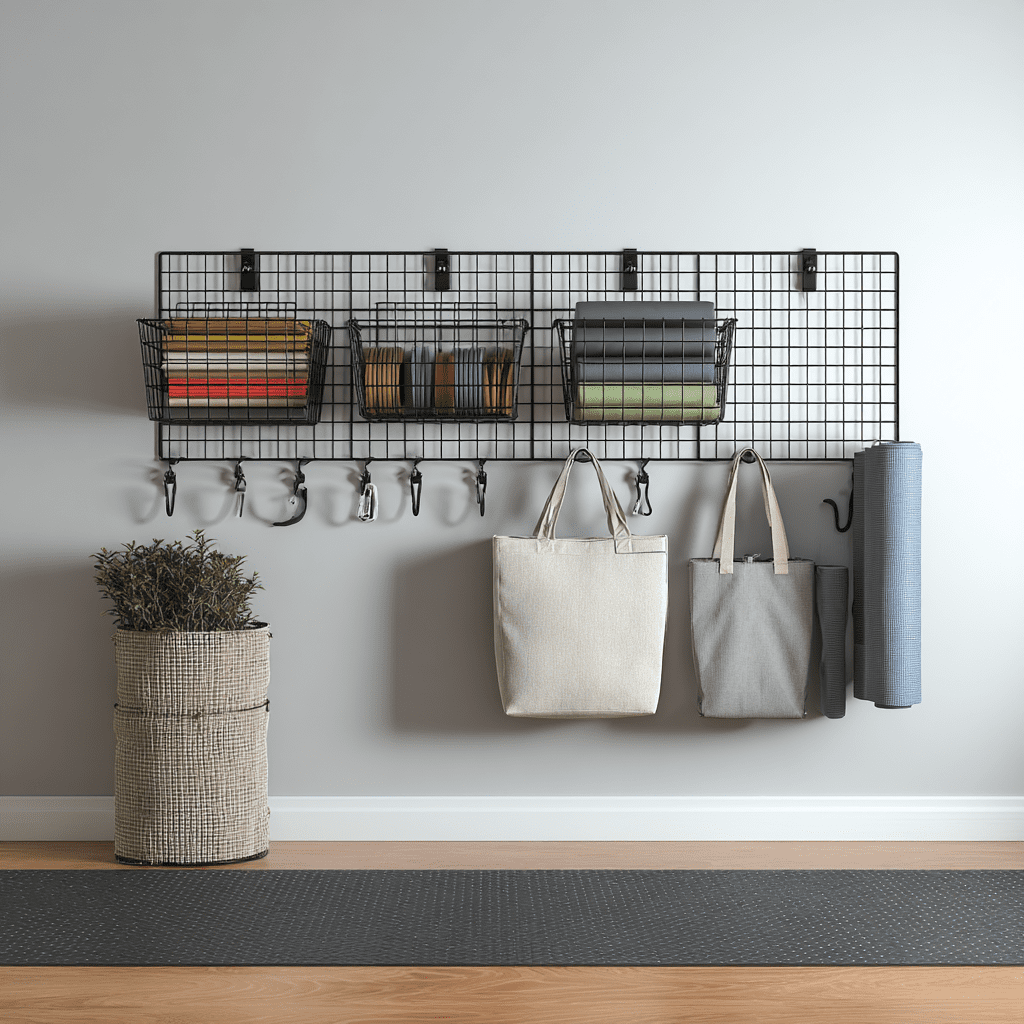 A storage grid organizes everything from bands to yoga mats to small weights. You’ll know exactly where everything is, and it keeps your basement feeling neat.