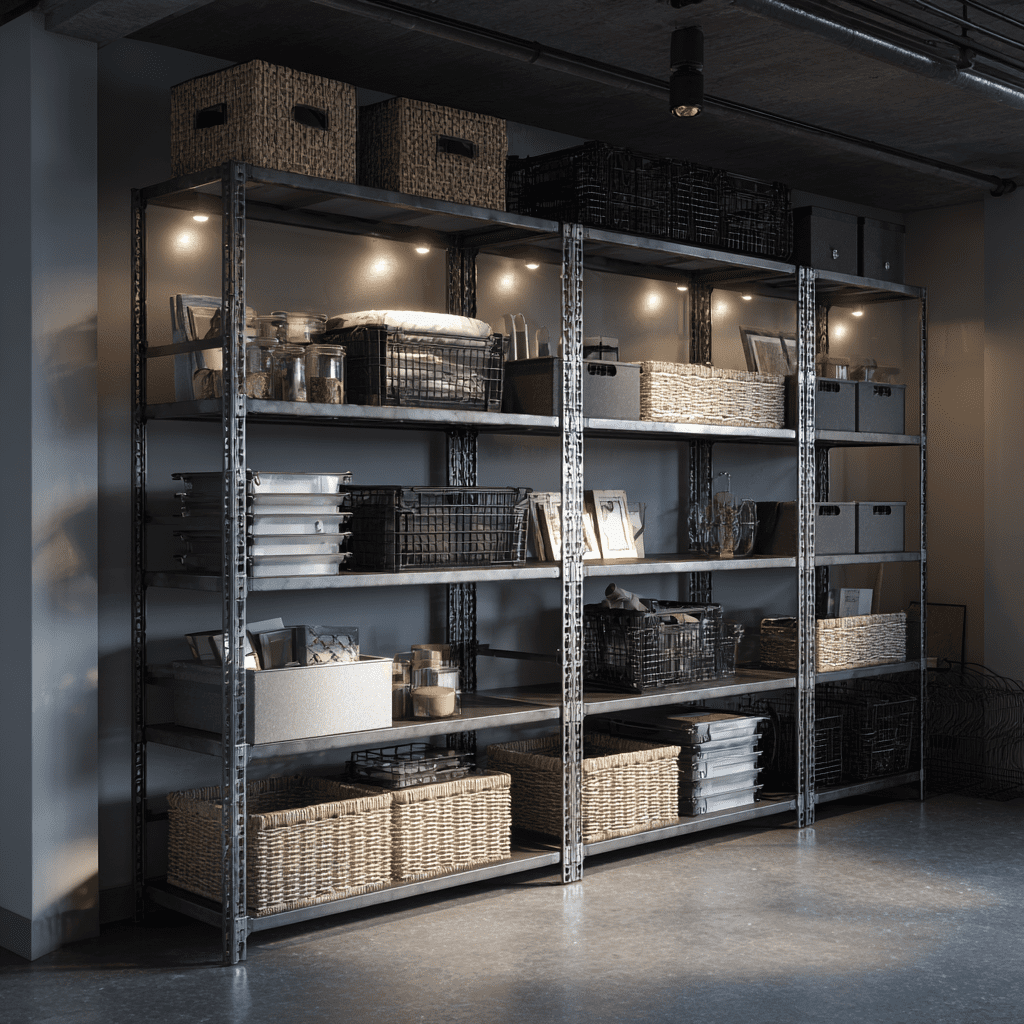 Adjustable metal shelves are tough, roomy, and ridiculously flexible. You can change the shelf height anytime, which is a lifesaver when storage needs shift. They’re perfect for basements because they handle weight and moisture like pros.