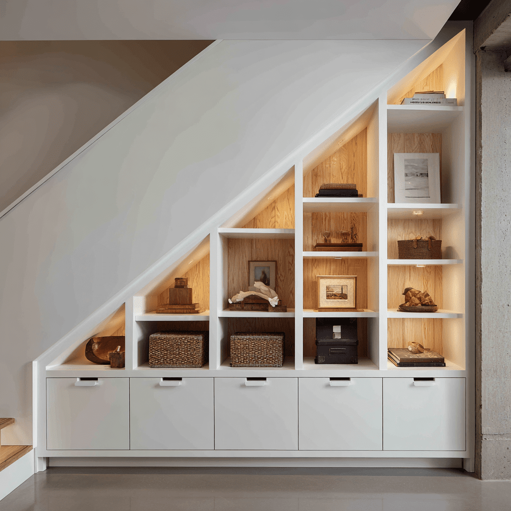 Under the stairs is usually wasted space, but built-ins turn it into pure storage gold. You can add drawers, shelves, or cubbies that fit perfectly into the angled space. It’s custom, clever, and super practical.