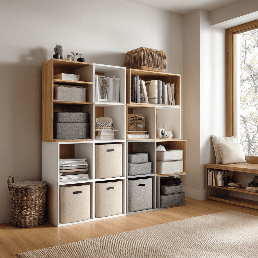 Cube storage gives your basement a fresh, modern look while keeping everything organized. Mix and match cubes to suit your space, or add baskets for hidden storage. It’s flexible, stylish, and ridiculously easy to set up.