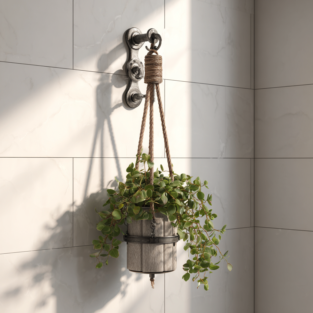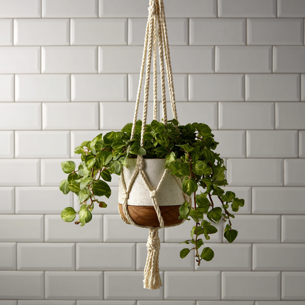 A rope macrame hanger brings soft texture and warmth to your bathroom. It’s perfect if you want a boho touch without overwhelming the space. Plus, it keeps your plant secure and safely suspended.
