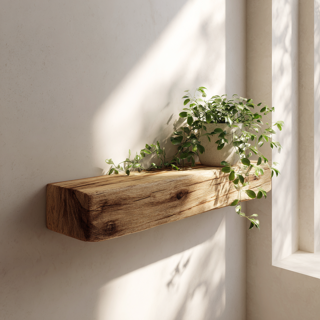 A wooden floating beam adds a rustic twist that feels warm and grounded. It’s basically a single beam mounted high on the wall, letting your plants drip gracefully over the edges. Super cute, IMO.