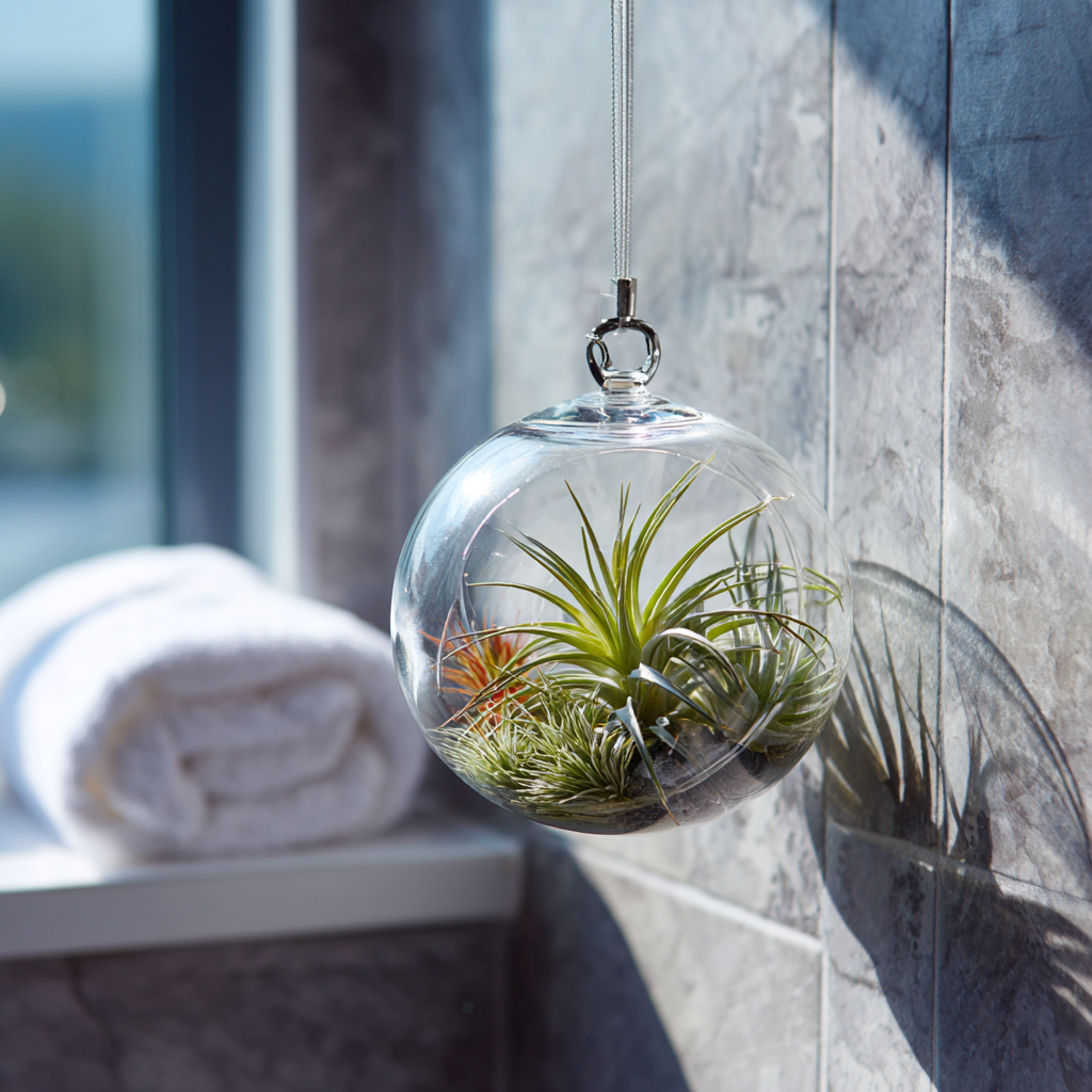 A hanging glass terrarium gives your bathroom a modern, airy look. It’s like a tiny world floating in your space.