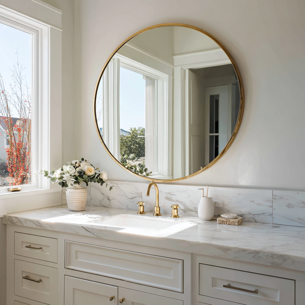 An oversized round mirror instantly softens a bathroom full of sharp lines. It spreads natural and artificial light evenly, making your space look more open and airy. Plus, its simple shape feels timeless, so it works with basically any vanity style.
