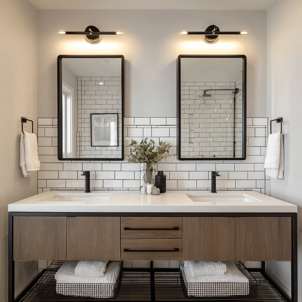 This style uses two matching mirrors over a double vanity, giving the whole setup symmetry and structure. It feels organized and polished without trying too hard. If your bathroom feels a little chaotic, these instantly pull everything together.