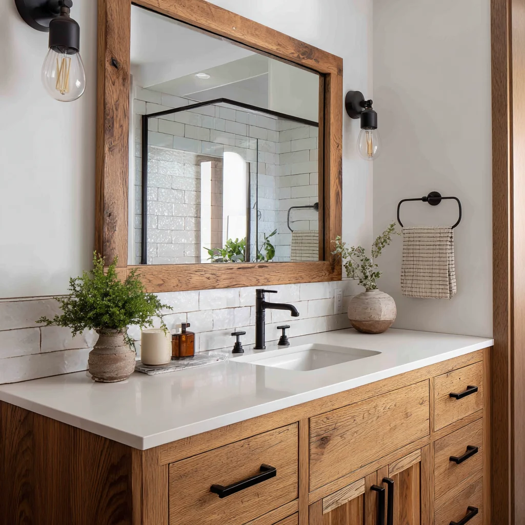 Want to add warmth fast? A wood-framed vanity mirror does that like magic. The natural texture makes your bathroom feel cozy and grounded, especially if everything else is sleek tile and cool-toned finishes. Think farmhouse charm but still polished.