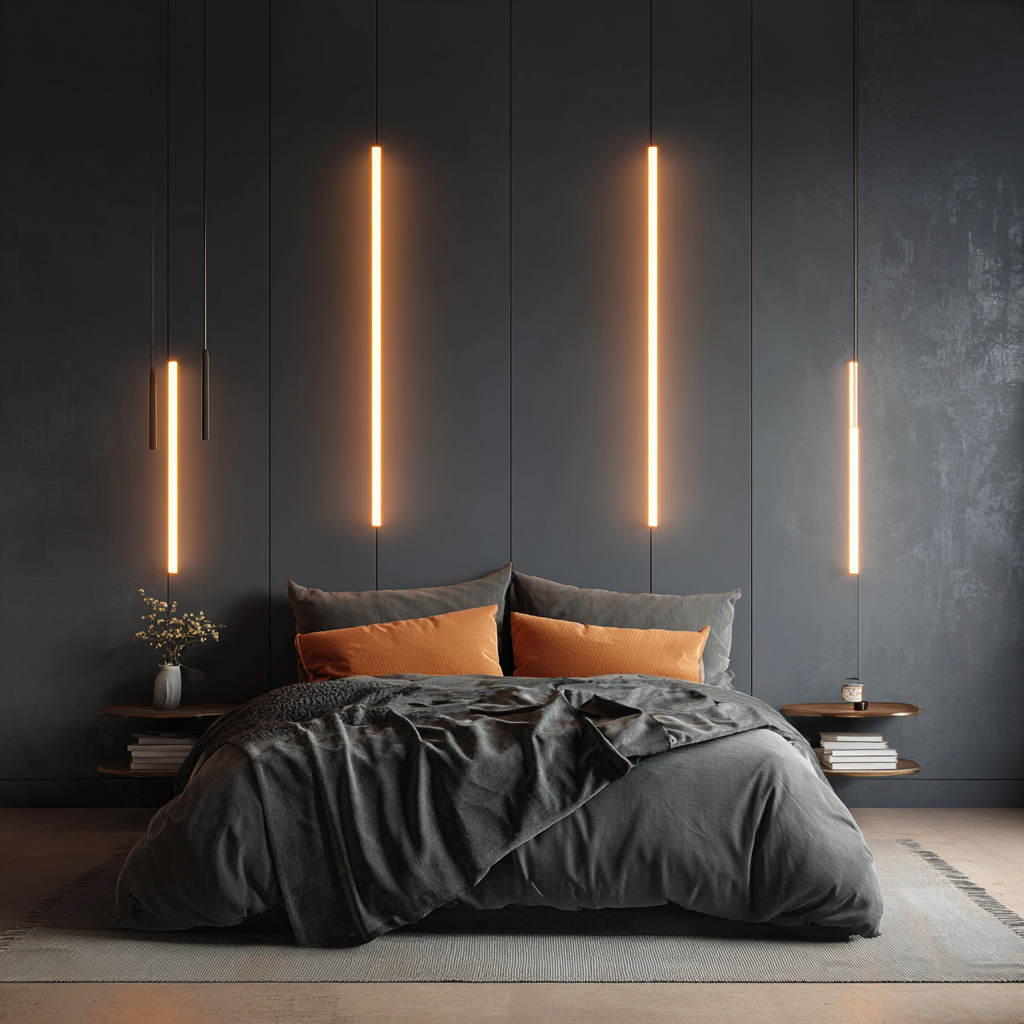 Vertical LED light bars create sleek lines that elongate your accent wall. They make the room feel taller and more polished, almost like something you’d see in a luxury apartment.