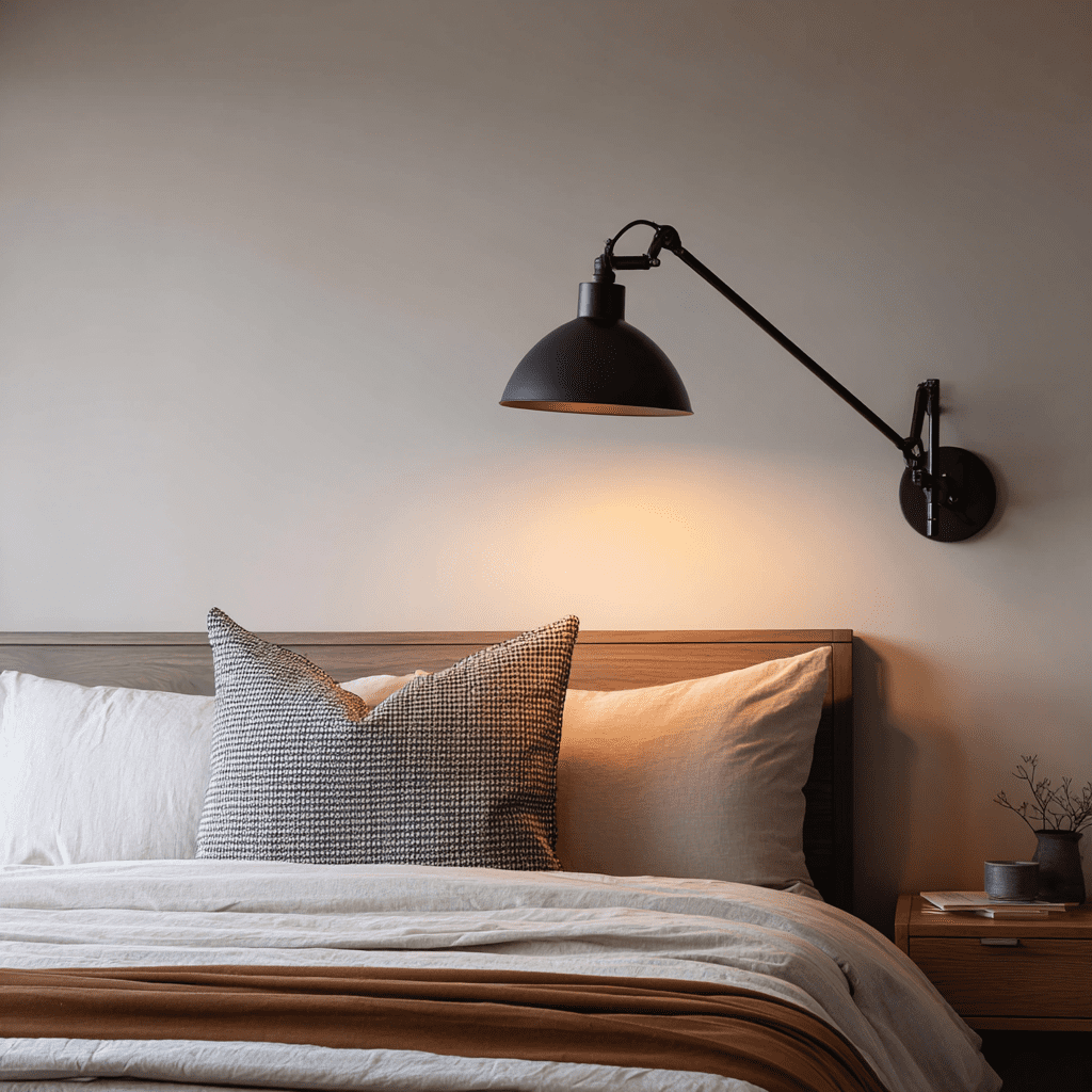 A wall-mounted swing arm lamp is a total space-saver, especially if your nightstand feels cramped. It mounts directly to the wall and adjusts exactly where you need light, making late-night reading super comfortable.