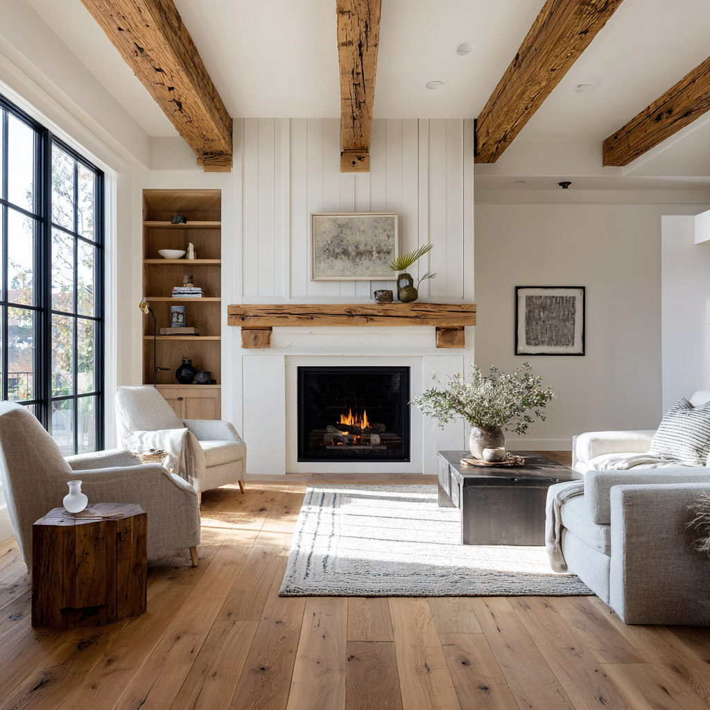Natural timber beams can add rustic charm to a board and batten fireplace. You can install them above the mantel or use them to frame the entire fireplace surround.