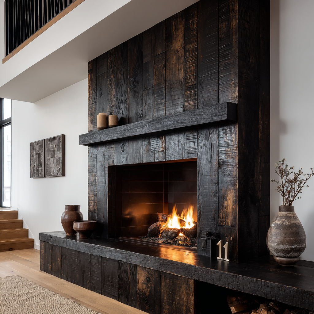 A charred wood board and batten fireplace brings a unique, rustic look to your space. This technique creates a dark, textured surface that adds depth and character.