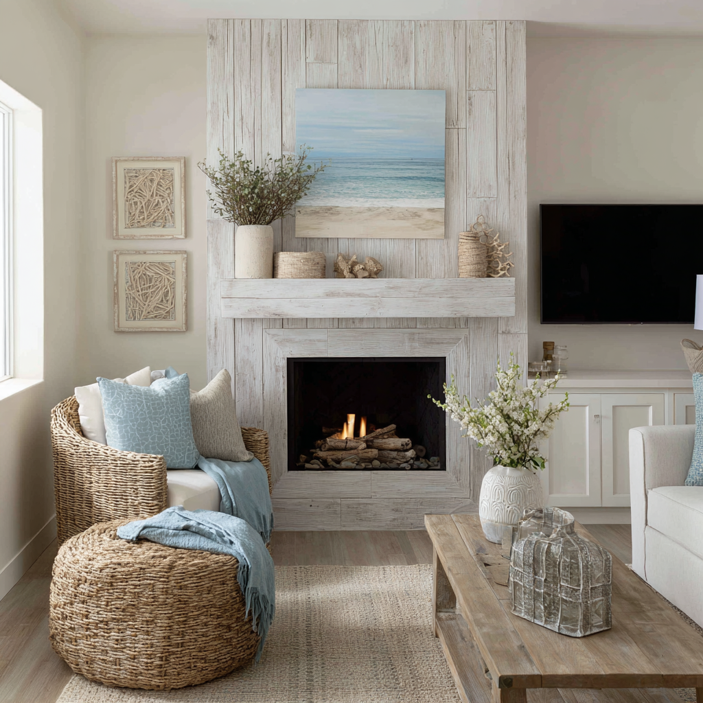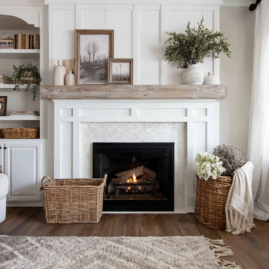 Pair your whitewashed fireplace with natural elements like woven baskets or greenery for a fresh, inviting look.