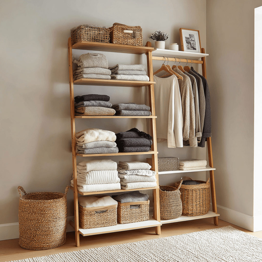 Ladder-style shelving leans against the wall and instantly adds vertical storage without permanent installation. It’s perfect if you rent or like switching things up often.