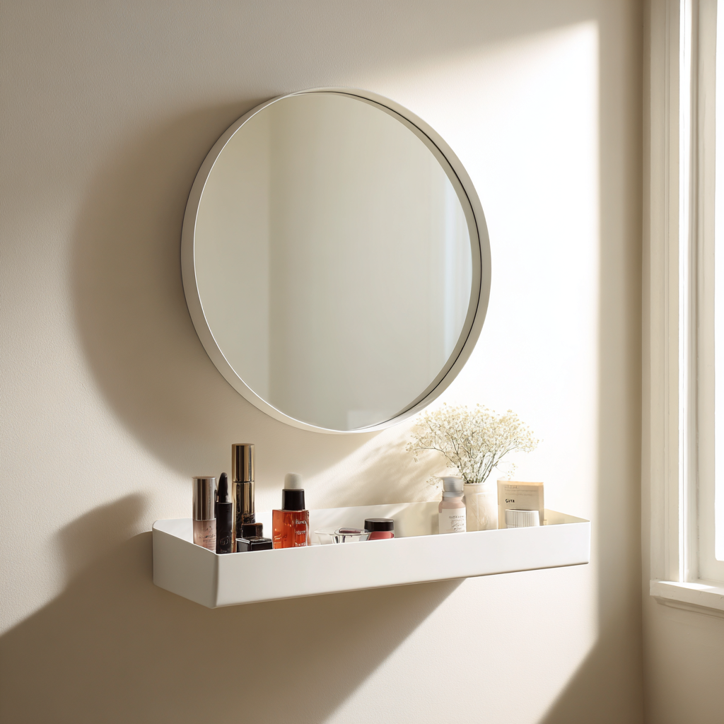 A wall-mounted makeup ledge is basically a slim shelf that acts like a mini vanity. It’s amazing for micro-spaces where a full table just won’t work. All your daily items sit within reach without sticking out too far.