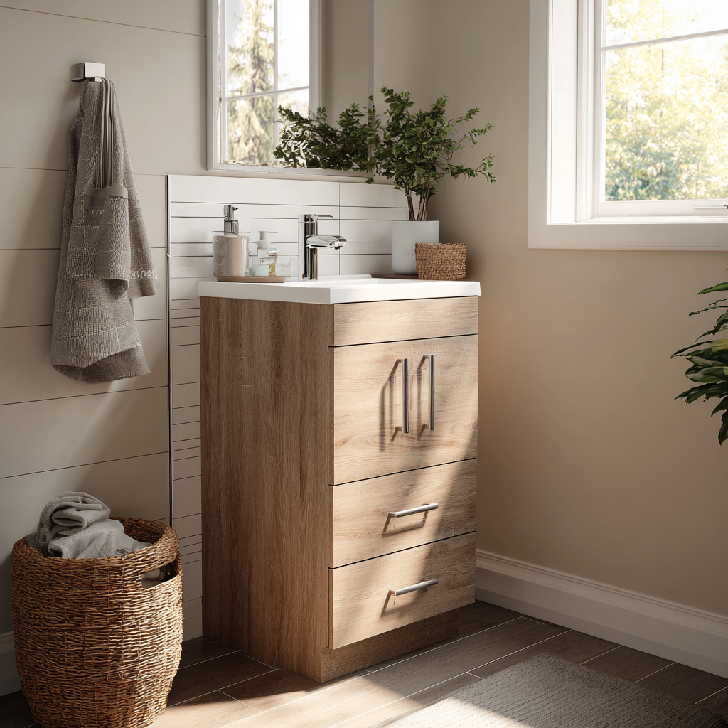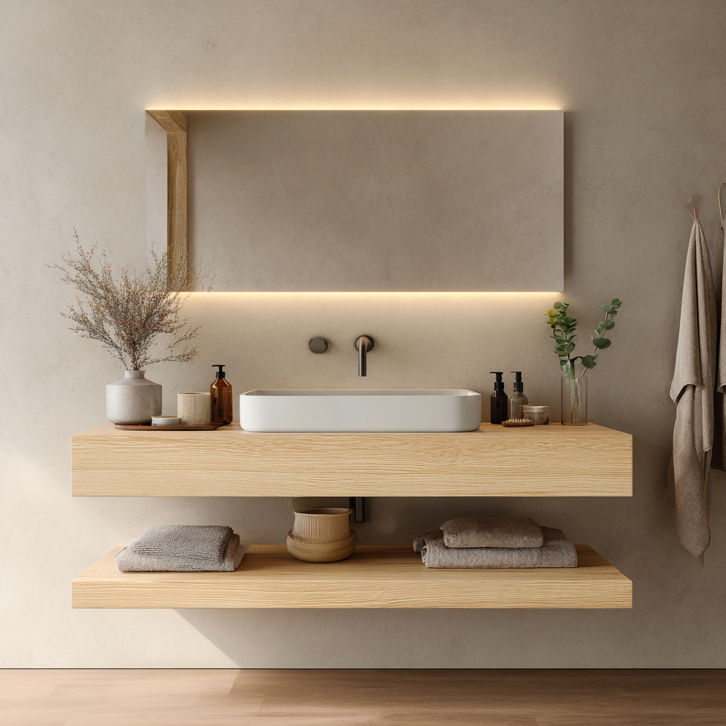 A floating wall vanity frees up floor space and instantly makes your room feel lighter. Since it’s mounted on the wall, it gives you room underneath for baskets or small storage bins. It’s a clean, modern way to keep things airy.