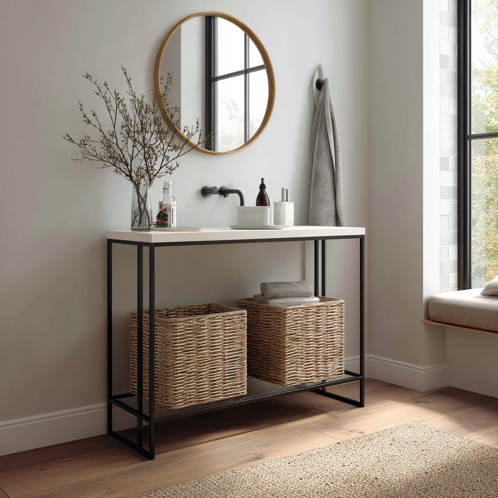 A narrow console vanity is perfect when you’ve got a slim wall that needs to work harder. It lets you keep essentials without crowding the room. Think of it as a “just enough” solution that still adds style.