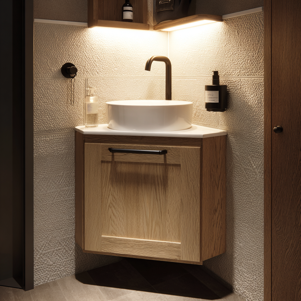 A corner sink vanity turns unused space into a practical beauty zone. Corners are usually awkward, but this setup transforms them into problem solvers. You get all the essentials without blocking traffic flow.