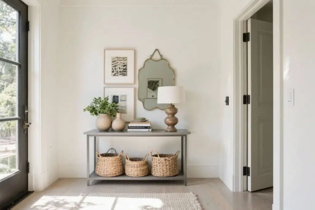 Symmetry is soothing—especially in entryways. Try matching lamps or balancing two similar vases on either end. Then add a slightly off-center tray or sculpture to keep it from feeling too formal.