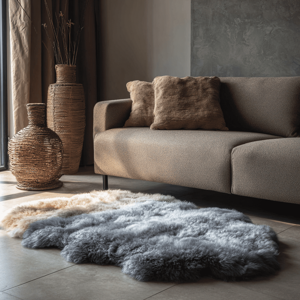 Adding a grey sheepskin rug to your living room can create a cozy and inviting atmosphere. The soft texture underfoot is perfect for relaxing evenings.