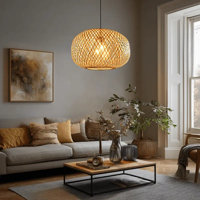 A bamboo pendant light brings warmth and texture to your grey living room. The natural material adds an organic feel that complements grey tones.