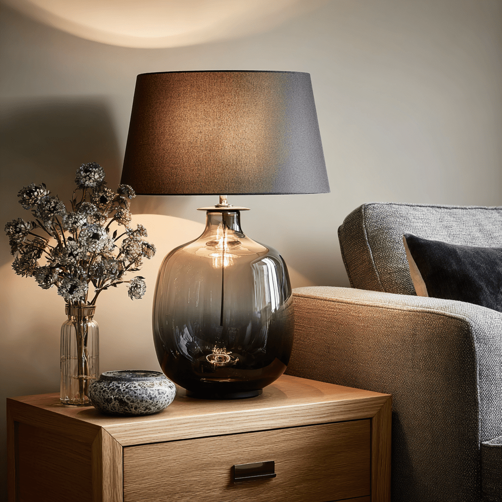 A smoky glass lamp can add a touch of elegance to your grey living room. Place it on a side table to create a cozy atmosphere.