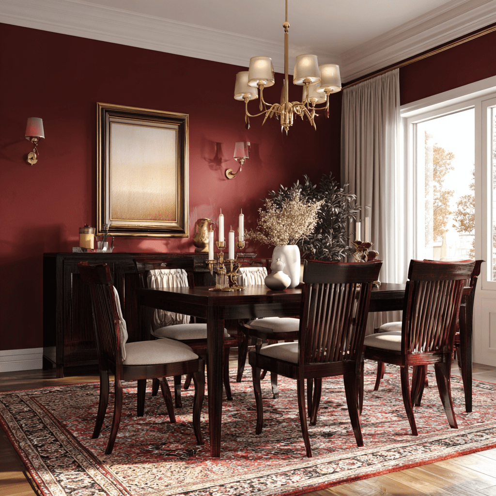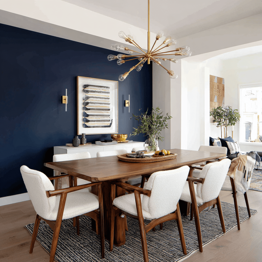 Your dining room’s accent wall color greatly influences the space’s mood and ambiance. Color psychology shapes the atmosphere in your dining room. Bold colors like deep red or navy blue create a dramatic, sophisticated look for formal occasions.