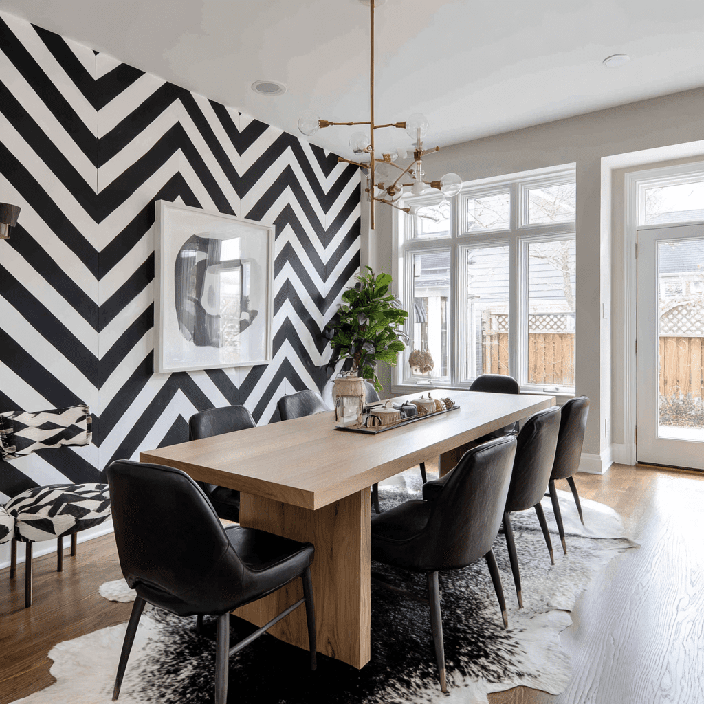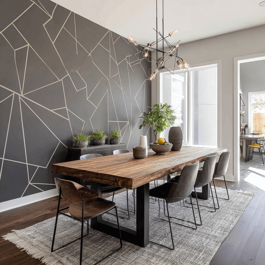 A painted geometric wall instantly adds movement and energy to your dining space. It’s basically wall art and design combined into one bold statement.